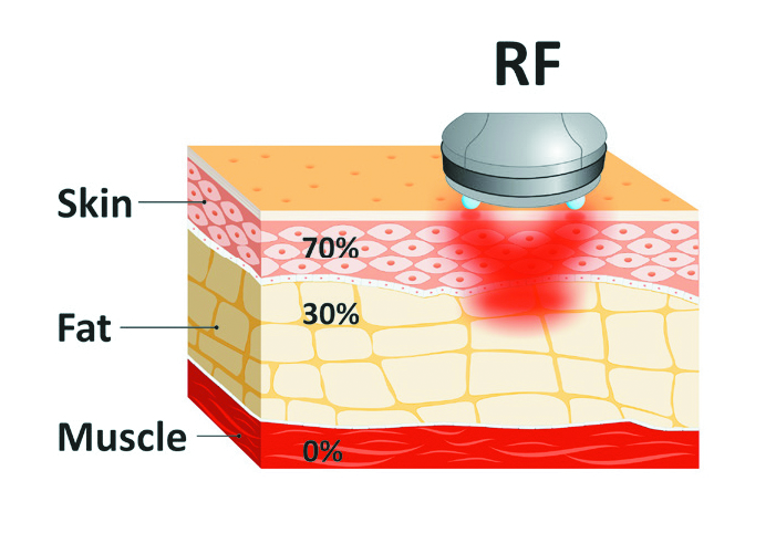 При использовании РЧ насадок ситуация иная. Для Coolwaves проводимость самых наружных слоев кожи, по меньшей мере, в 3,5 раза выше, чем для широко используемых в эстетической медицине радиочастотных систем излучения. Это означает, что большая часть радиочастотной энергии задерживается в эпидермисе и дерме, нагревая их до такой степени, что существует риск повреждения ткани. Более того, поскольку радиочастотная энергия распространяется близко к поверхности, она не достигает гиподермы, где расположены жировые клетки, чьи мембраны должны быть разрушены, чтобы процедура была эффективной.